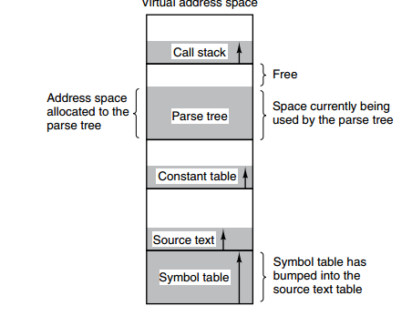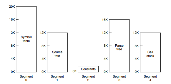 下图为一个编译器在编译过程中建立的多个表,有 4 个表是动态增长的,如果使用分页系统的一维地址空间,动态增长的特点会导致覆盖问题的出现。