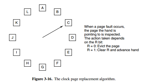 当页面被访问 (读或写) 时设置该页面的 R 位为 1。需要替换的时候,检查最老页面的 R 位。如果 R 位是 0,那么这个页面既老又没有被使用,可以立刻置换掉;如果是 1,就将 R 位清 0,并把该页面放到链表的尾端,修改它的装入时间使它就像刚装入的一样,然后继续从链表的头部开始搜索。