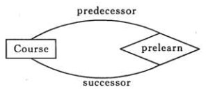 下图表示一个课程的先修关系,先修关系出现两个 Course 实体,第一个是先修课程,后一个是后修课程,因此需要用两条线来表示这种关系。