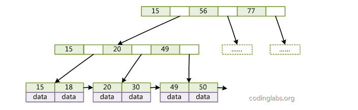 进行查找操作时,首先在根节点进行二分查找,找到一个 key 所在的指针,然后递归地在指针所指向的节点进行查找。直到查找到叶子节点,然后在叶子节点上进行二分查找,找出 key 所对应的 data。
